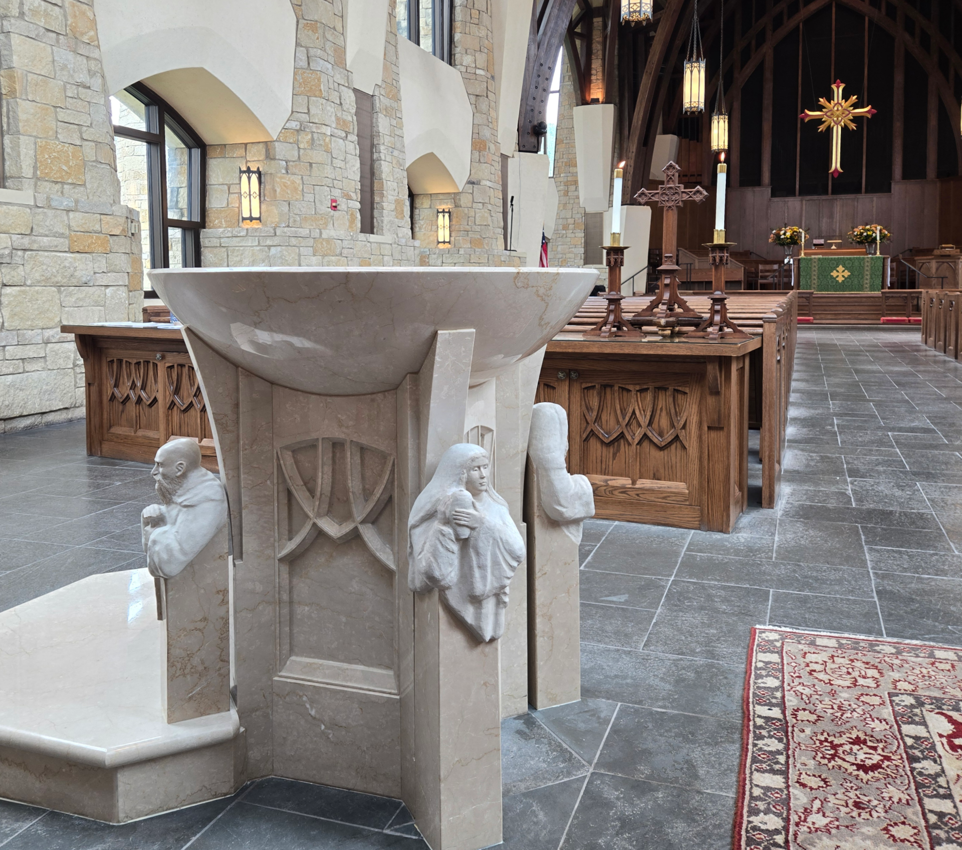 Figure of Christ on an arc with large medallions sculpted with symbols representing the different sacraments.